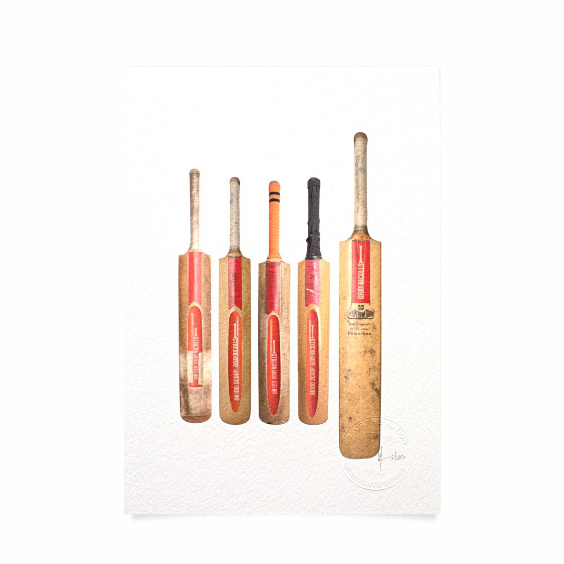This artwork, (one of 100) printed on German Hahnemuhle Etching paper (310gsm) features several examples of arguably the most iconic bat design of the past 50 years; the Gray Nicolls 'Scoop'. The radical concept which was centred around a prominent hollowed out section at the back of the bat, (primarily to widen the sweet spot & reduce weight), led to a period of experimentation by the leading bat makers around bat shapes.