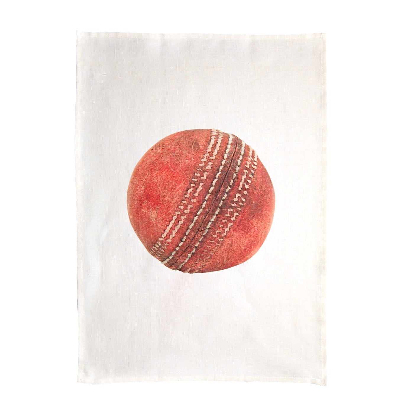 The artwork on this 100% Linen tea towel features a high resolution photograph of a vintage cricket ball which is severely worn from prolonged use.