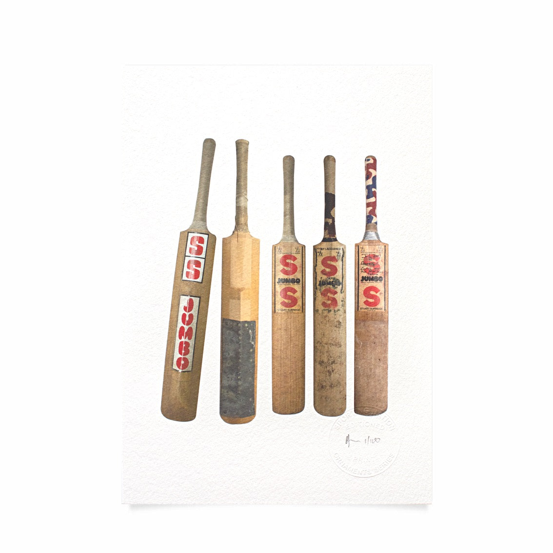 This artwork, (one of 100) printed on German Hahnemuhle Etching paper (310gsm) features several examples of the SS Jumbo, an iconic bat of the 1980's that became a favourite the world over. Heavier than the average bat due to its exaggerated back, the bat was catapulted to super stardom when the world's most charismatic batsman, Viv Richards, began using it to great effect.