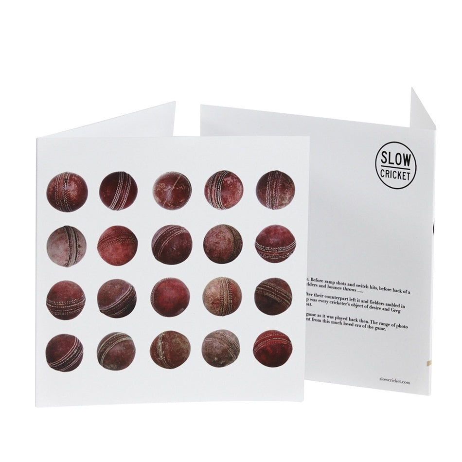 $7.20 Sold outThis artwork features a line up of 20 well worn cricket balls. The card has a matt laminate outer and is printed on a 350 gsm stock. When folded it measures 15cm x 15cm. A plain white envelope is included and both are wrapped in a clear cellophane sleeve.
