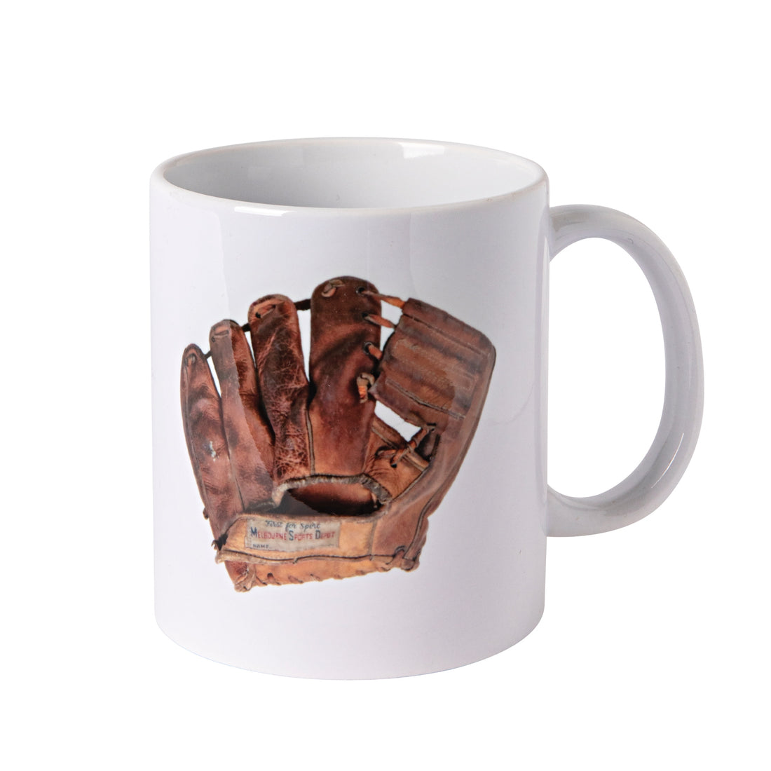 The image on this mug shows a vintage baseball glove featuring the distinctive marking of the Melbourne Sports Depot. The mug is dishwasher and microwave safe and is housed in a protective cardboard box.