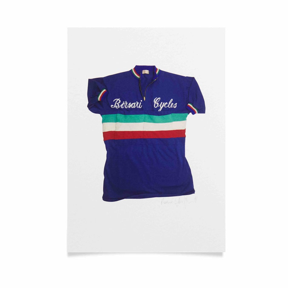 $30.00This artwork, (one of 100) printed on German Hahnemuhle Etching paper (310gsm) shows a superb vintage cycling jersey, (circa 1960’s), which had been worn by a cyclist racing for the Borsari Cycles team, a name synonymous with the sport in this country for more than 75 years. The paper guarantees archival standards and features a textured surface which has the spe ...
