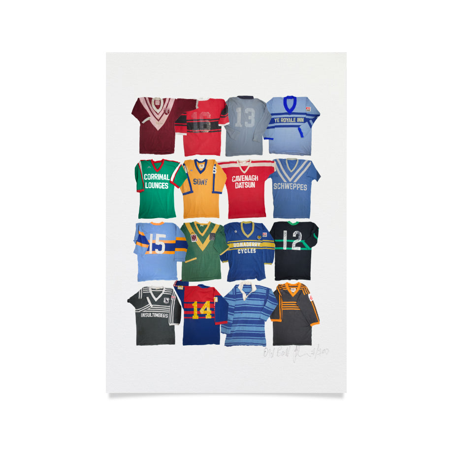 $30.00This artwork, (one of 100) printed on German Hahnemuhle Etching paper (310gsm) shows sixteen superb vintage Rugby League jerseys, (circa 1980’s). The paper guarantees archival standards and features a textured surface which has the special touch and feel of genuine art paper. The artwork is housed in a clear plastic sleeve.