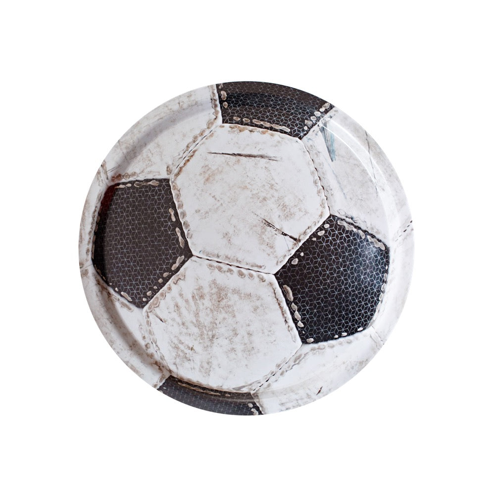 The design on this tray features a well worn version of the classic black & white hexagon soccer ball which has become an unofficial symbol of the game since its introduction in 1970. This unique dining tray has been handcrafted in Sweden on the island of Öland using birchwood certified by the Forest Stewardship Council & organic melamine. this beautiful piece is food Safe & Dishwasher Proof & has a 39cm circumference.