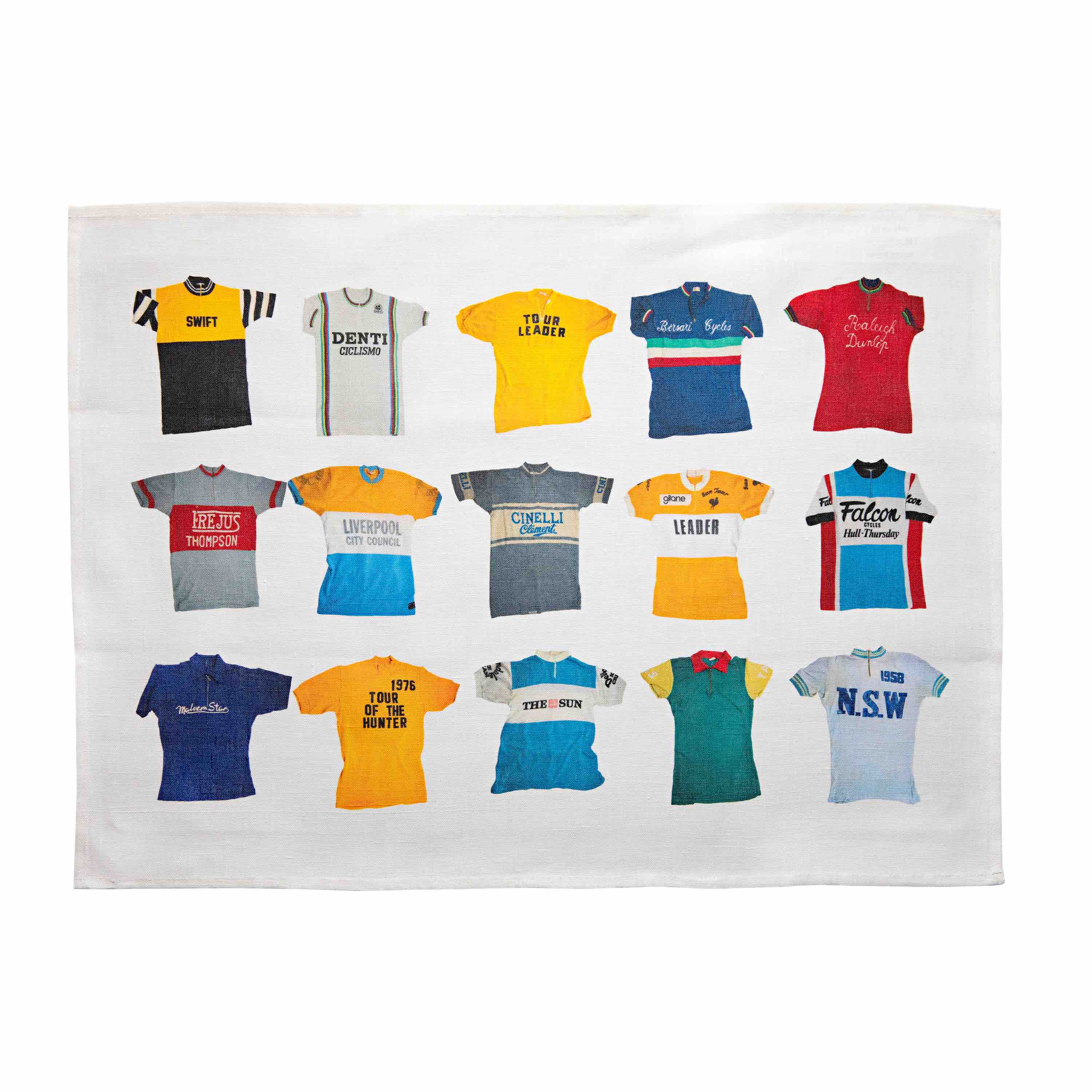 The image on this Tea Towel shows fifteen superb vintage cycling jerseys from the Australian cycling scene. Featuring road and track jerseys, the design will evoke fond memories for riders of the 1950's - '80's in particular. Among them are several race team jerseys, tour leader's tops and training jerseys with overseas cycling brands writ large.