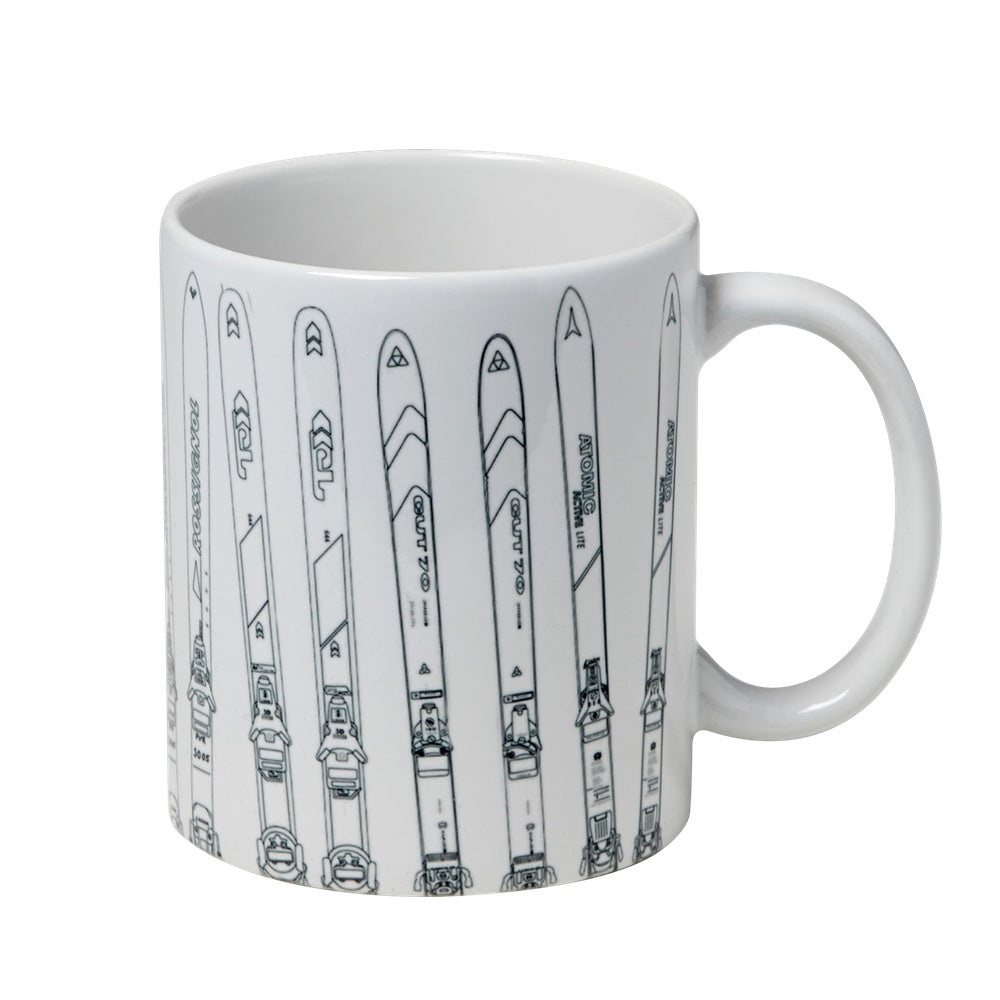 This mug features an outlined version of photographs of eight pairs of vintage alpine skis.