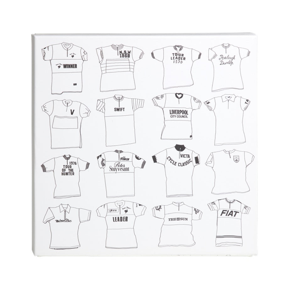 This artwork features an outlined version of photographs of 16 vintage cycling jerseys.