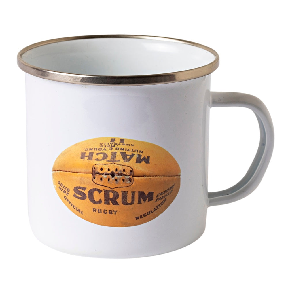 The image on this enamel mug shows a beautifully worn vintage Rugby Union Football, manufactured by the Melbourne firm Nutting & Young.